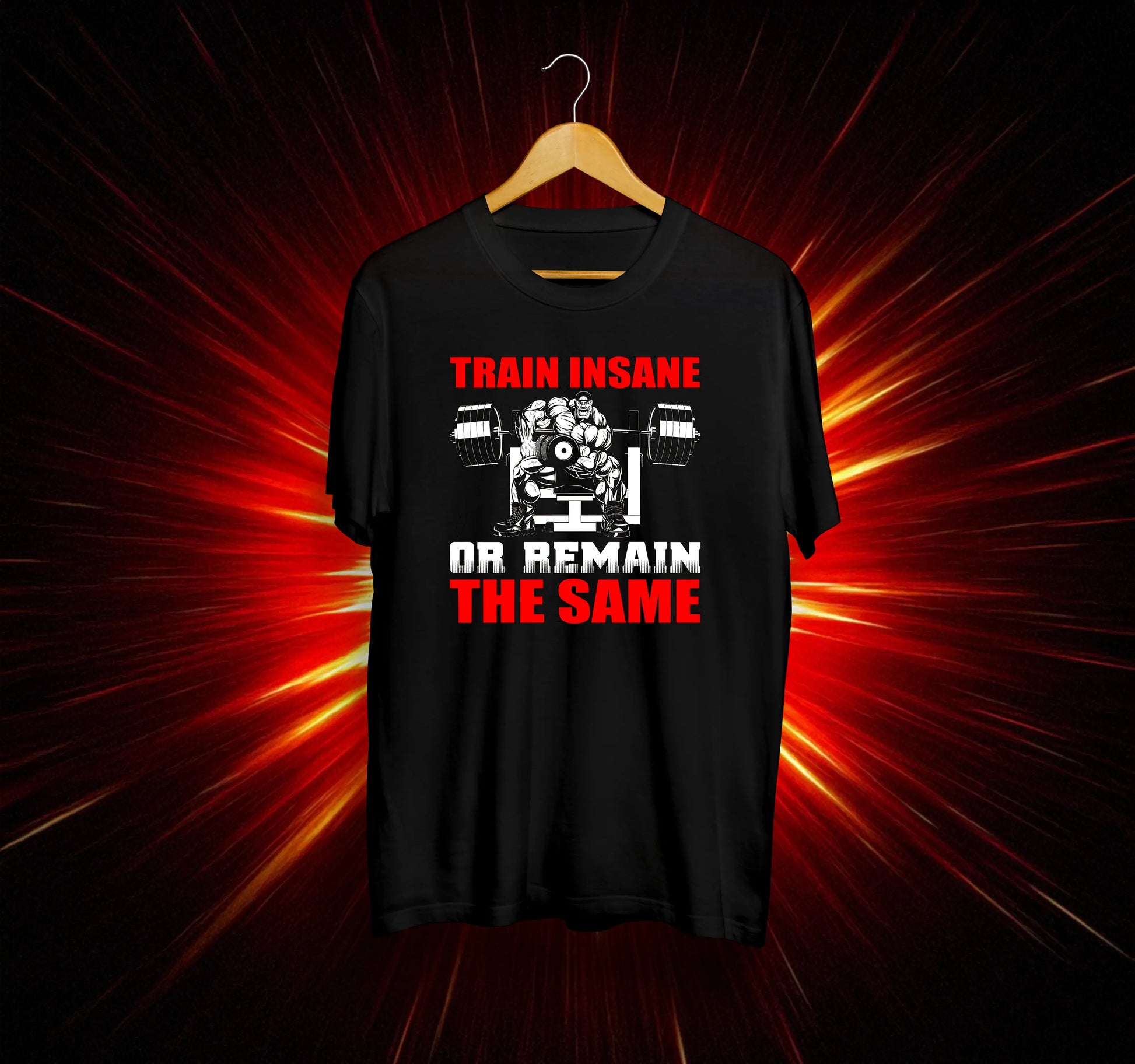 Тази тениска е създадена за истинските фитнес ентусиасти, които вярват в максималната отдаденост към тренировките и личното развитие. С мотивиращия надпис "Train Insane or Remain the Same", тя е идеална за всеки, който иска да изрази своята страст към спорта и активния начин на живот.